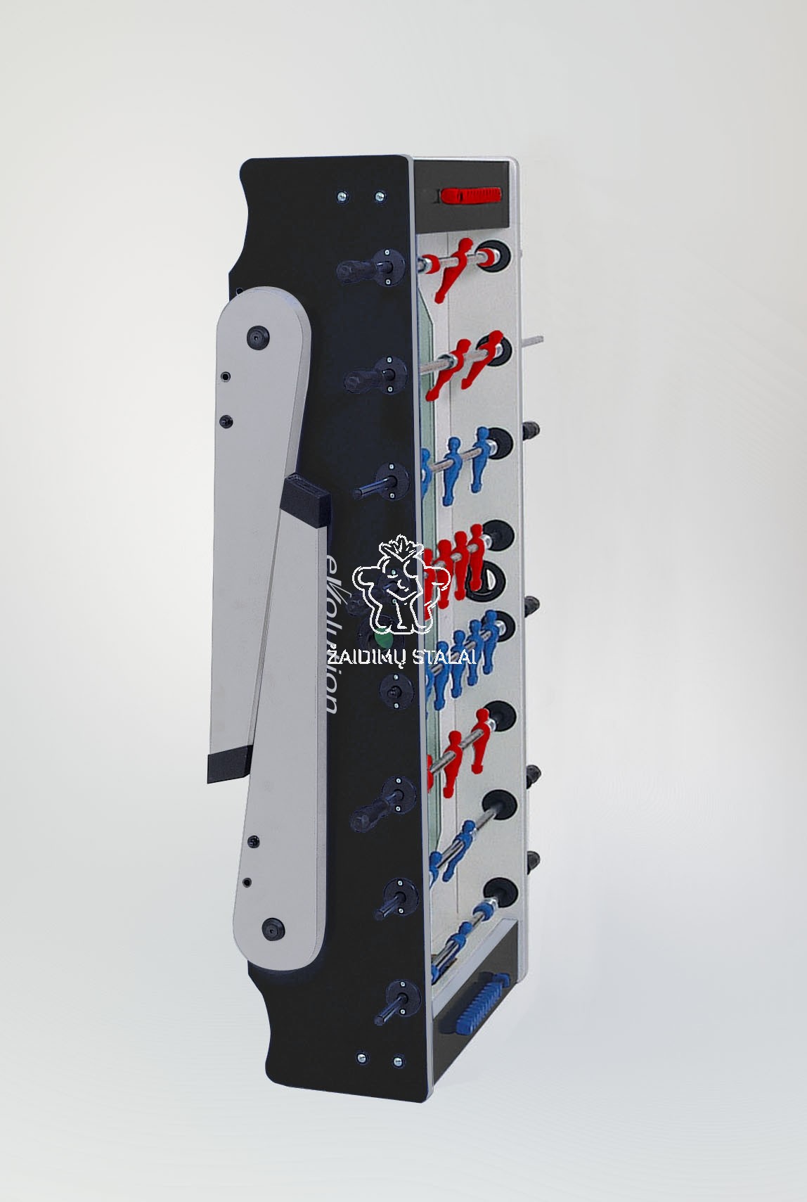 Rafinuotas juodos ir sidabro spalvų derinys subtiliai pabrėžia išskirtinę stalo formą, ant kurios ryškiai išsiskiria „Evolution“ logotipas. Kontrastingi raudoni ir mėlyni žaidėjai suteikia dinamišką vizualinį akcentą.