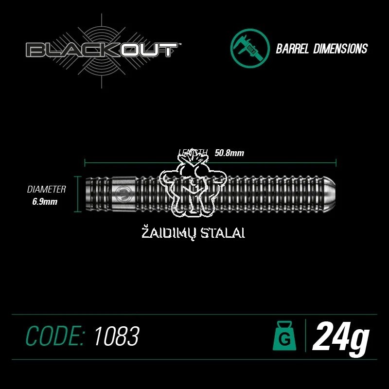 Winmau Blackout 1 strėlytės – preciziškai suprojektuotas 90 % volframo (tungsten) steel tip rinkinys, pasižymintis klasikiniu paraleliniu barrelio profiliu ir viso ilgio apvaliais grioveliais, kurie suteikia vidutinio lygio sukibimą bei aiškų kontrolės pojūtį metant. Centro svorio pasiskirstymas ir tvirta konstrukcija padeda užtikrinti stabilų skriejimą ir patikimą trajektoriją tiek treniruotėse, tiek varžybose.