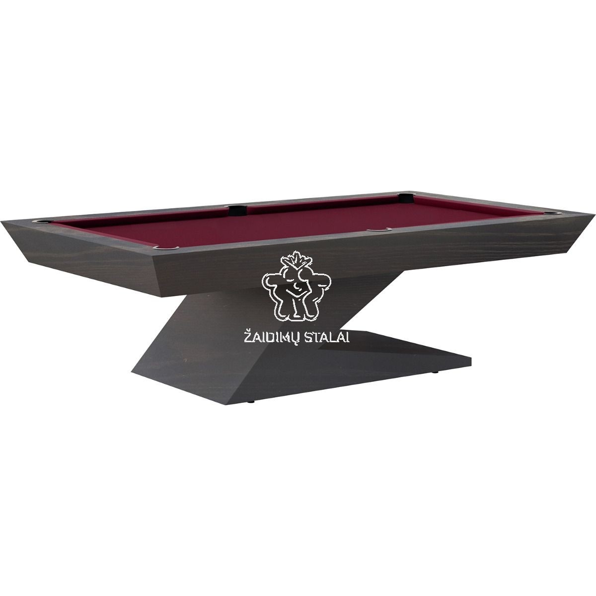 In addition to the striking appearance and design, the Zeta 9 ft pool table has a fantastic build quality that ensures stability and an excellent playing experience. The top frame of the Zeta pool table is made of solid wood and the base consists of steel finished with veneered MDF. The playing field of the 9ft Zeta pool table consists of three 30 mm slate plates and has a size of approximately 1,27 by 2,54 meters. The sheet is included and can be ordered directly in almost any desired color from the Simonis brand. This Zeta 9ft pool table with its sleek, contemporary design will be the centerpiece of any room, whether at home or in the office. The total size of this Buffalo Zeta 9ft pool table in the color wengue is 292 cm x 165 cm. In order to have enough space to play, a play area of 427 by 554 cm is needed. The Zeta pool table owes its name to the striking Z shape. Zeta is a letter of the Greek alphabet and the capital letter of Zeta is written as Z.